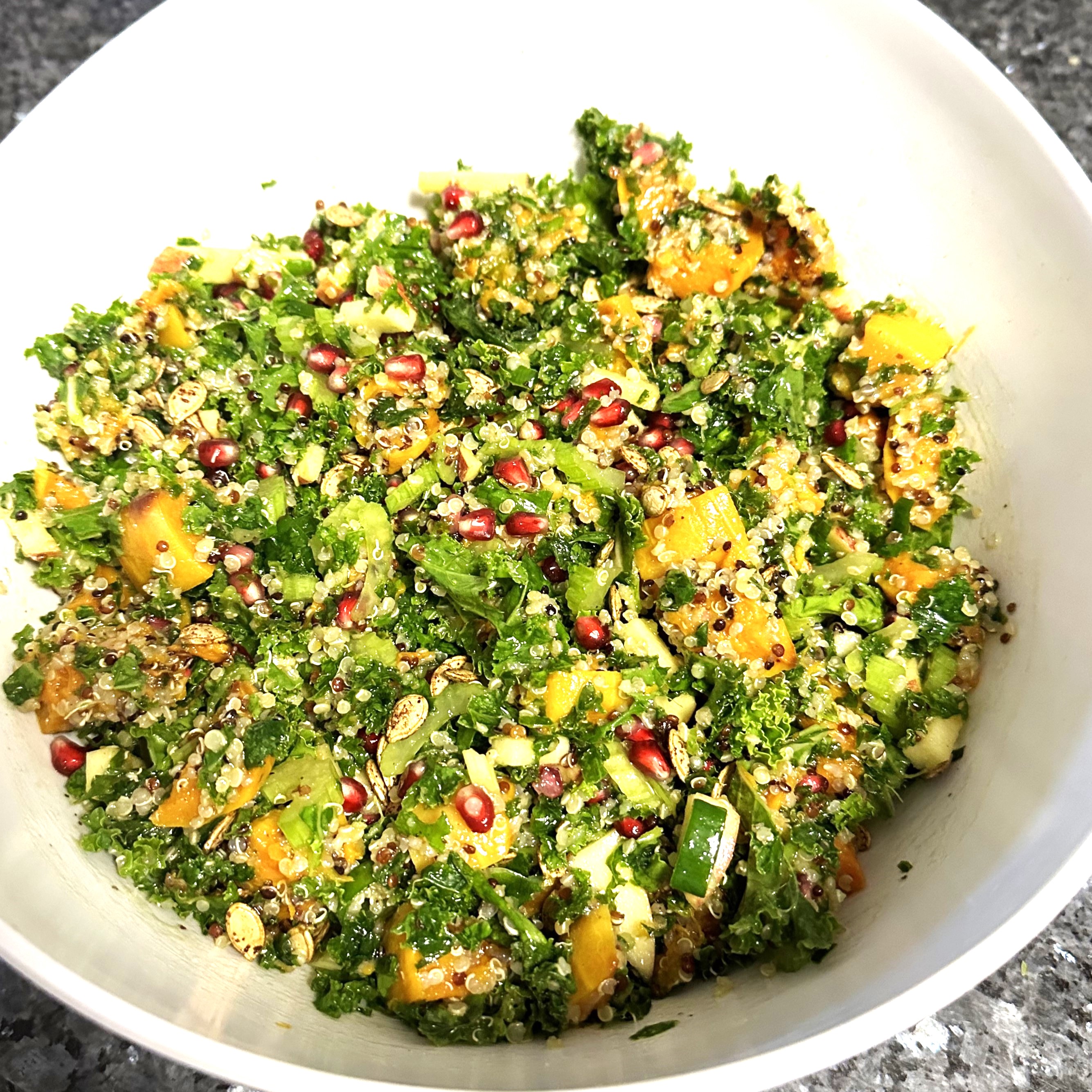 - Assemble the salad: Add the kale with a pinch of salt in a large bowl. Massage the kale for 1 minute. Then add the quinoa, butternut pumpkin, apples, celery, onion, feta cheese, pumpkin seeds and pomegranate seeds. Just before serving, add the vinegarette, and toss gently to coat.