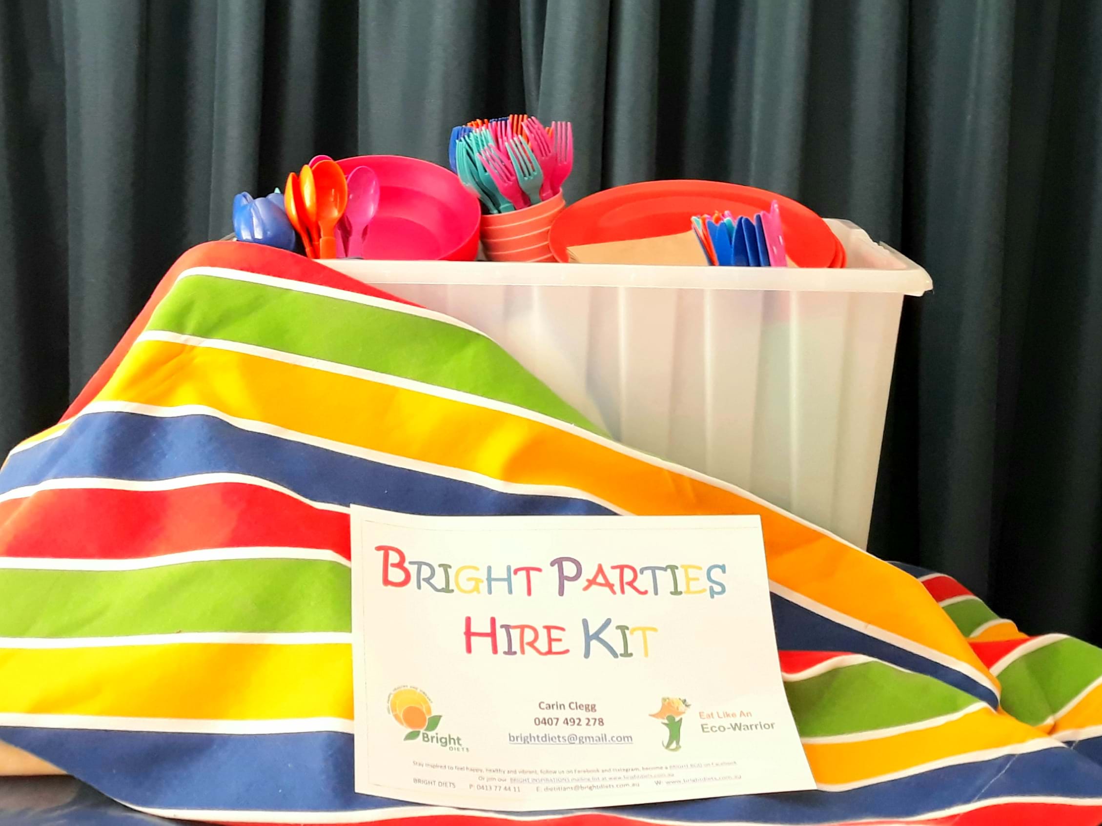 The Bright Parties hire kit caters for up to 30 people with a rainbow theme which suits boys or girls parties and costs $40 to hire plus a $50 cash deposit upon pick up.